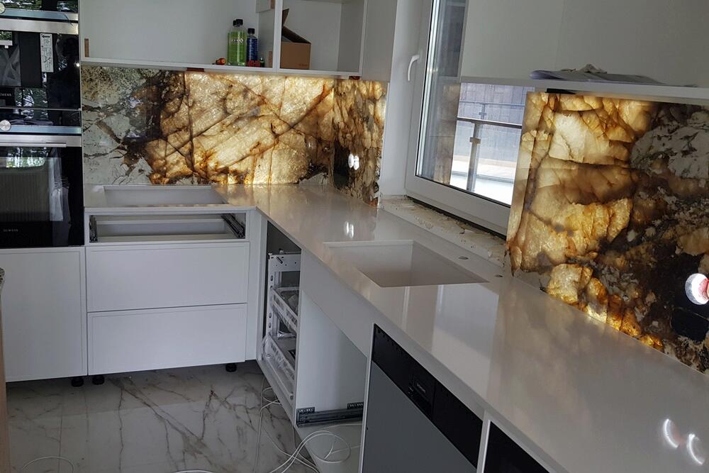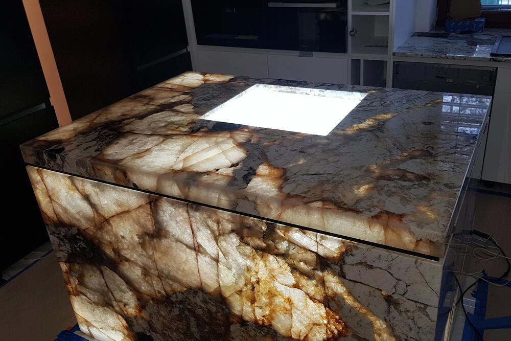 Podświetlony kwarcyt Patagonia to nie tylko funkcjonalny blat kuchenny, ale również element dekoracyjny, który nadaje wnętrzom niepowtarzalny charakter. Efektowne podświetlenie podkreśla unikalność tego kamienia, tworząc magiczną atmosferę w każdym pomieszczeniu.