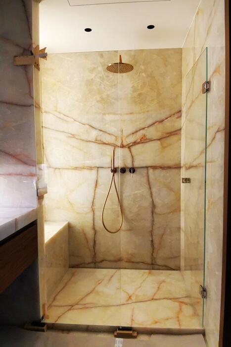 Szczególną uwagę podczas realizacji poświęcono na dopasowanie wzorów na płytach kamiennych. Staranne dobieranie poszczególnych elementów tak, aby tworzyły one naturalne przejścia czy efekty lustrzane, wymagało nie tylko precyzji, ale również głębokiego zrozumienia materiału. Efekt końcowy, gdzie wzory płynnie łączą się z elementu na element, podkreśla unikatowość i luksusową jakość wykonania.