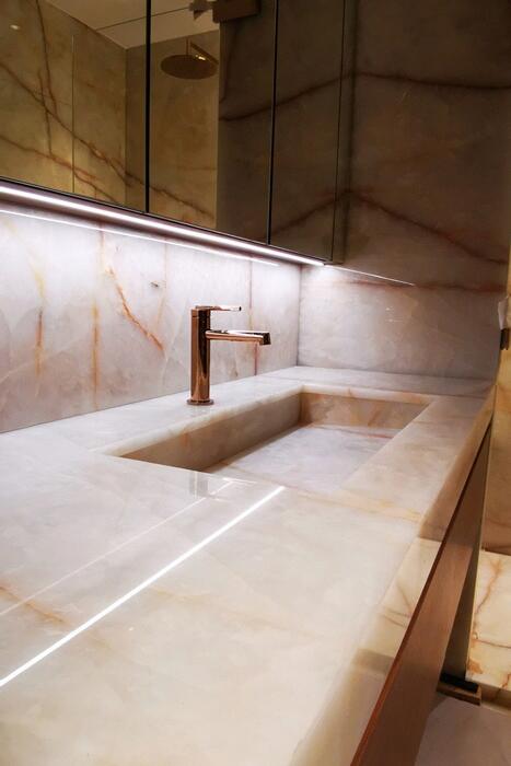 Łazienka w apartamencie stanowi prawdziwą oazę spokoju, gdzie kwarcyt Cristallo dominuje nie tylko na posadzkach i ścianach, ale również w strefie prysznica. Blat łazienkowy z umywalką kamienną, wyposażony w odpływ liniowy, oraz jedna ze ścian prysznica z podświetleniem, to przykłady, jak można twórczo i funkcjonalnie wykorzystać kamień w aranżacji wnętrz.
