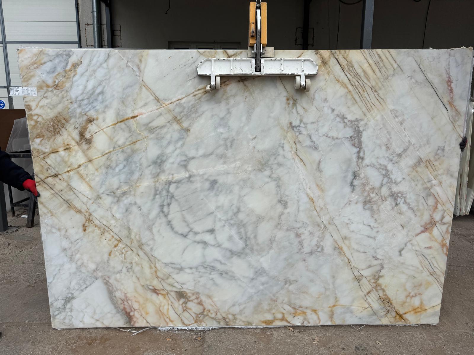 Calacata Gold to przezierny prawdziwy krystaliczny marmur, idealny do podświetlanych ścian.