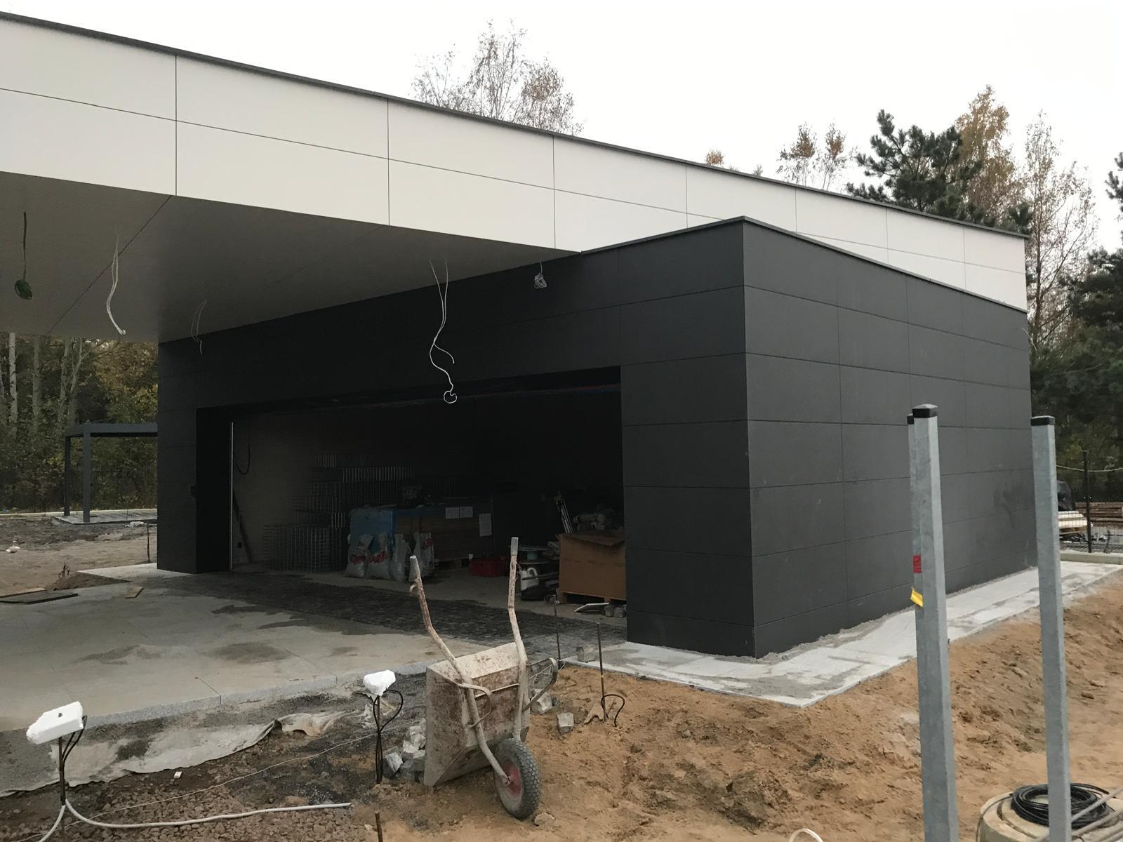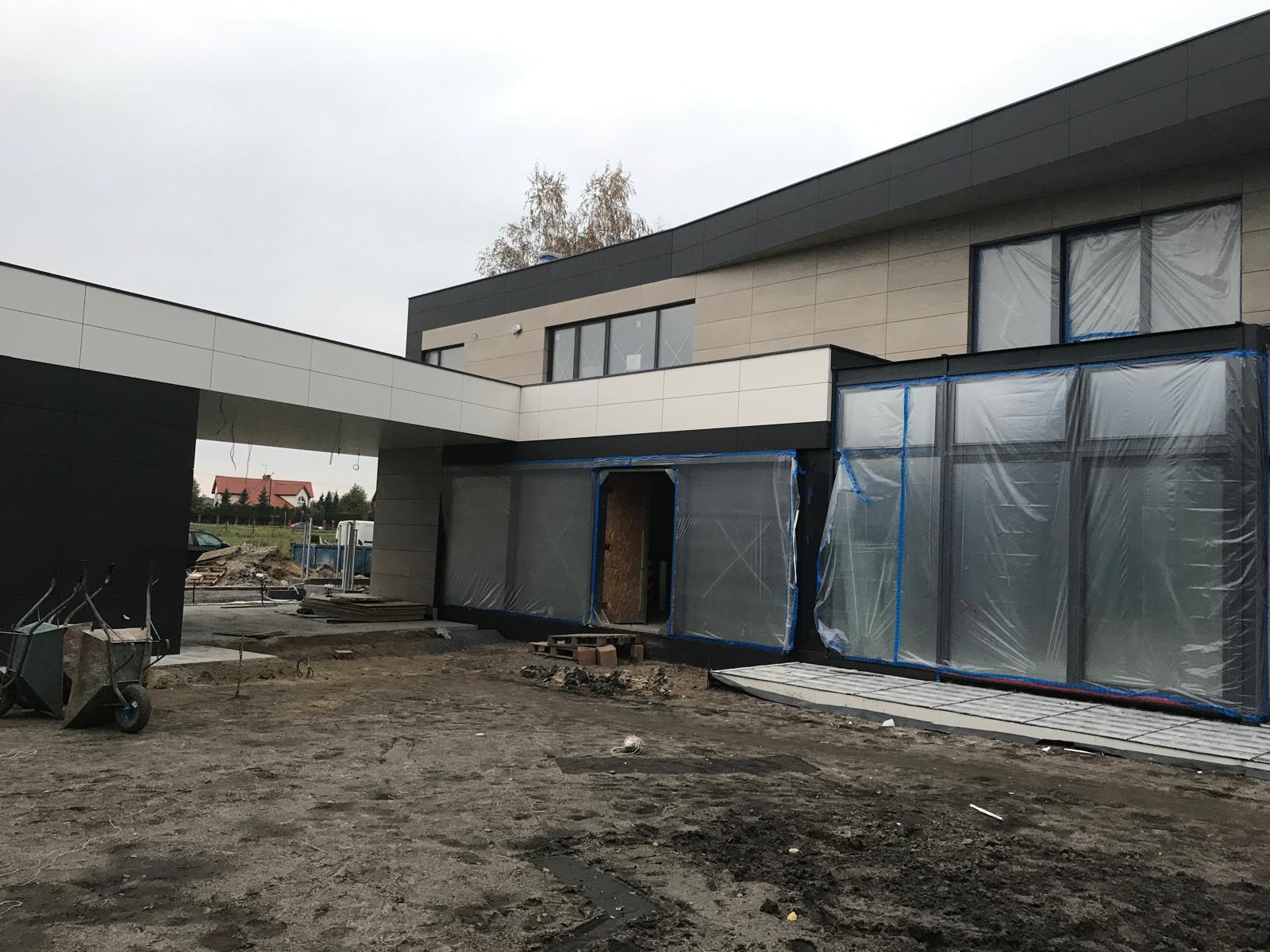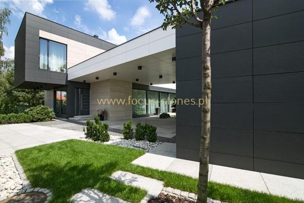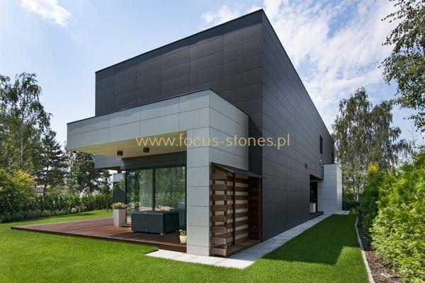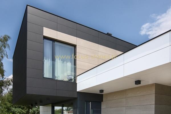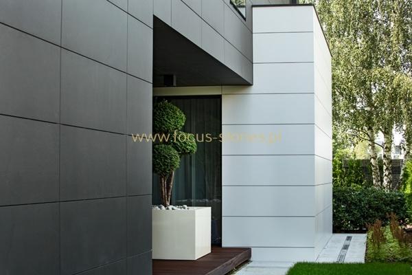 W tej realizacji elewacja nie jest jedynie okładziną budynku, lecz integralnym elementem architektury. Zastosowanie wielkoformatowych płyt pozwoliło na precyzyjne kształtowanie bryły, wyraźne podkreślenie linii podziału oraz zachowanie idealnych proporcji pomiędzy poszczególnymi segmentami domu.