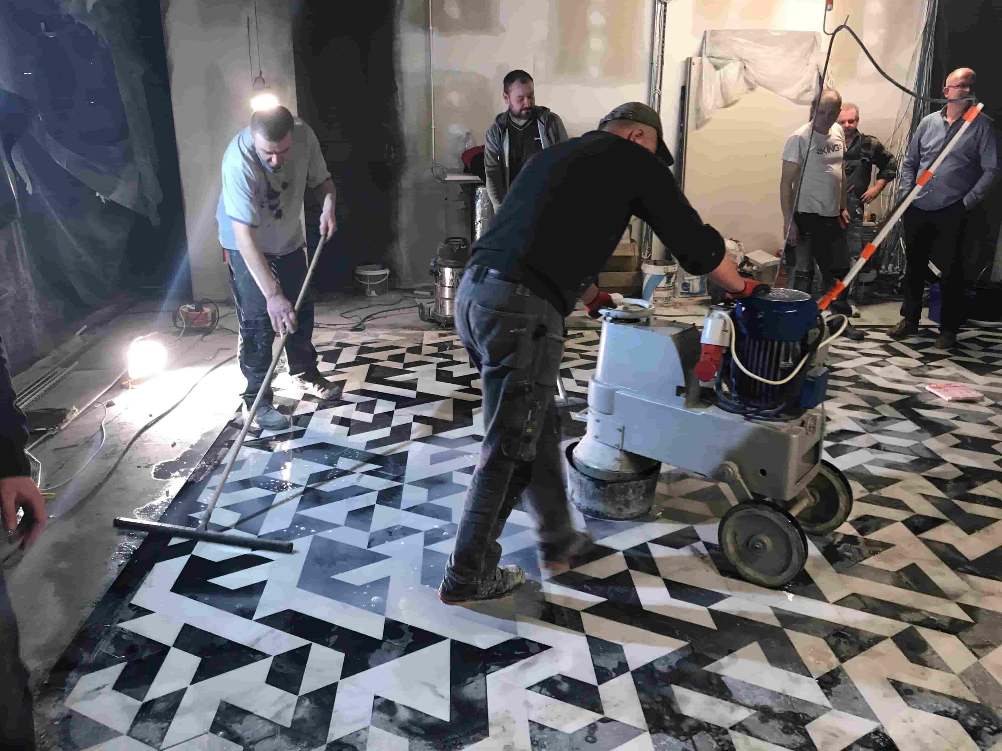 Taki sposób pracy ma również istotną zaletę użytkową — w przyszłości serwis i odświeżenie posadzki ogranicza się do maszynowego polerowania, bez konieczności ingerencji w strukturę rozety.
