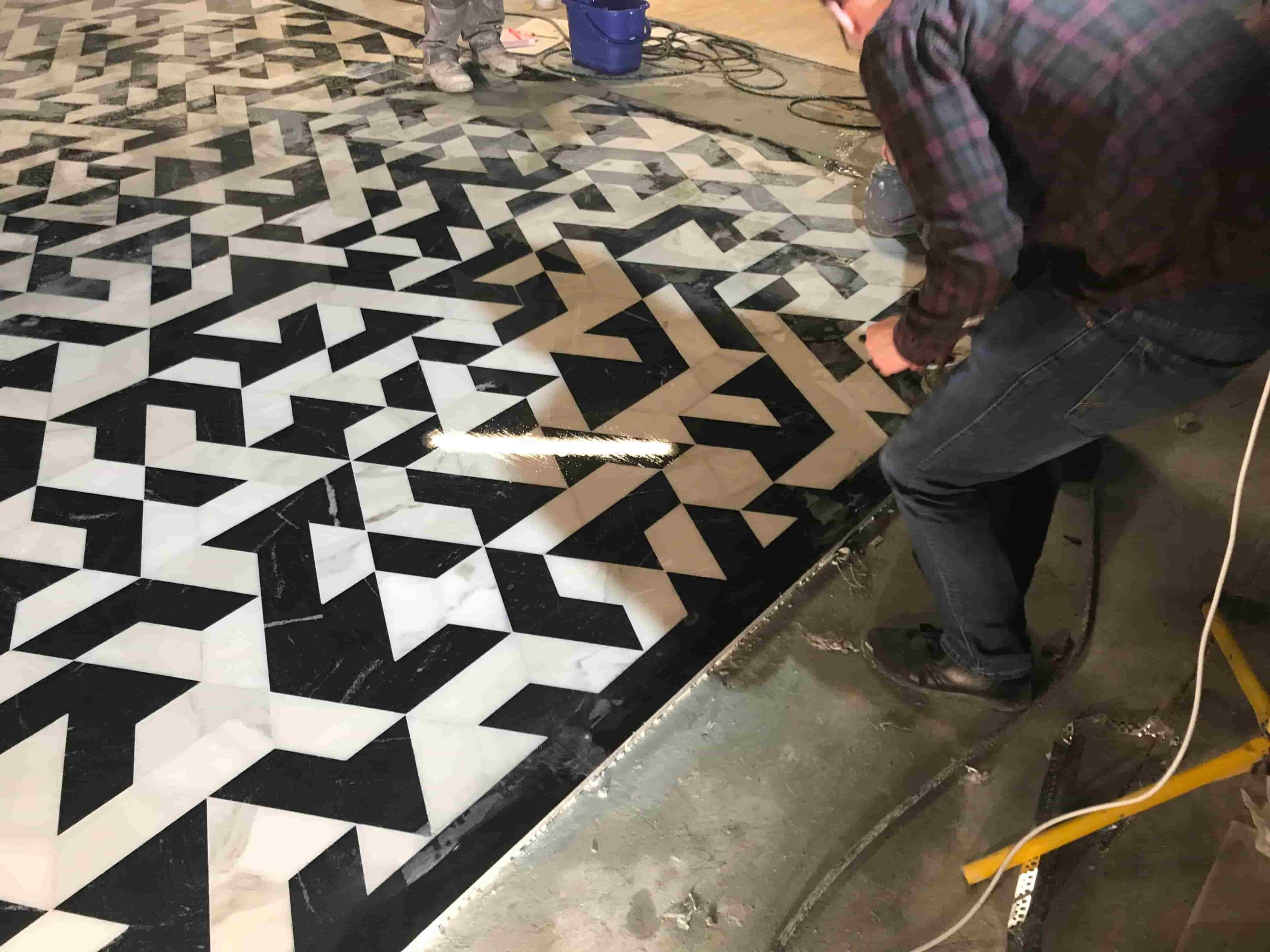 Przy większych kompozycjach, składających się z wielu elementów, szlifowanie wykonywane jest już po montażu na miejscu. Dzięki temu możliwe jest wyrównanie całej powierzchni po zalaniu fug, co zapewnia spójny rysunek i jednolite wykończenie.