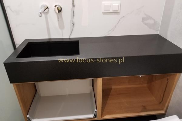 Zintegrowana umywalka z tego samego kamienia to doskonałe uzupełnienie blatu łazienkowego, tworząc harmonijną i spójną całość. Umywalka podwieszana, wykonana z granitu Indian Black Dark, idealnie współgra z blatem, zachowując jednolitość stylu i wyglądu. To rozwiązanie nie tylko dodaje łazience elegancji i prestiżu, ale także podkreśla nowoczesność i funkcjonalność tego projektu.